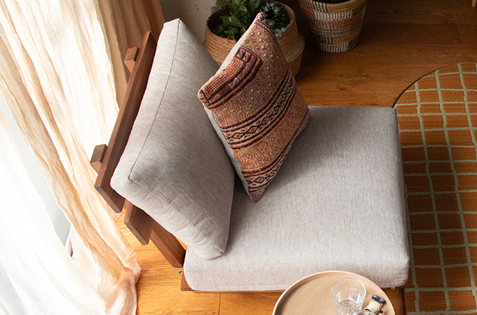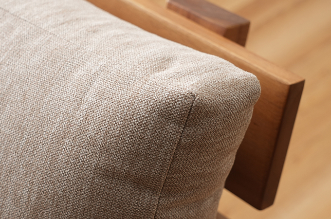 フレーム部分はあたたかみのある天然木。やわらかなシェニール糸を織り上げたファブリック生地のクッションの組み合わせです。