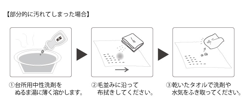 また、購入当初の【巻きくせ】や【部分的な汚れ】については下記手順のお手入れをおすすめしております。